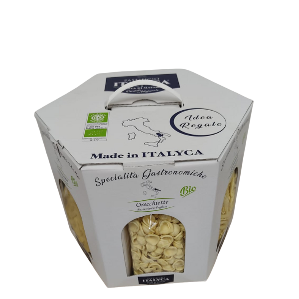 Per le festività il Pastificio Italyca vi delizierà con il fantastico pacco regalo, una scatola esagonale con ben sei diversi tipi di pasta artigianale BIO, ognuno capace di accogliere alla perfezione il condimen- to preparato per la vostra famiglia!Innovativo, interessante, nuovo, biologico e soprattutto conveniente!I formati saranno da 500g cadauno, per un totale di ben 3Kg.